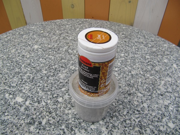 Für die Vertiefung für die Kerze habe ich auf die Schnelle nichts besseres gefunden als eine Gewürzdose. Da gibt es bestimmt noch bessere Alternativen. Ich habe den Becher nicht bis zum oberen Rand mit Beton gefüllt und anschließend die Dose in den Beton gedrückt (vorher auch hier von außen einölen) und am Anfang öfters kontrolliert, ob die Tiefe noch stimmt. Wenn der Beton dann erst einmal beginnt zu binden, bewegt sich da nicht mehr viel.